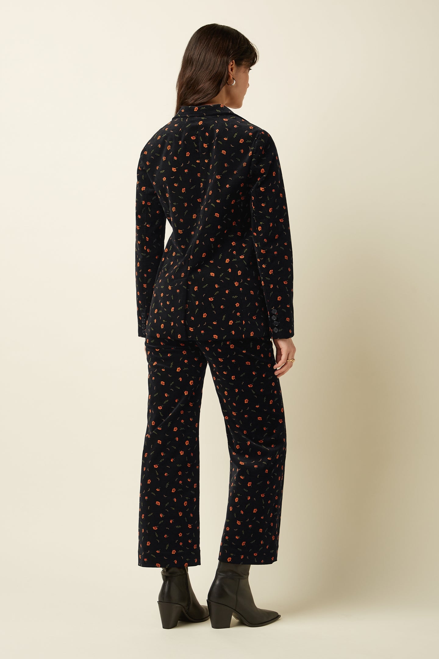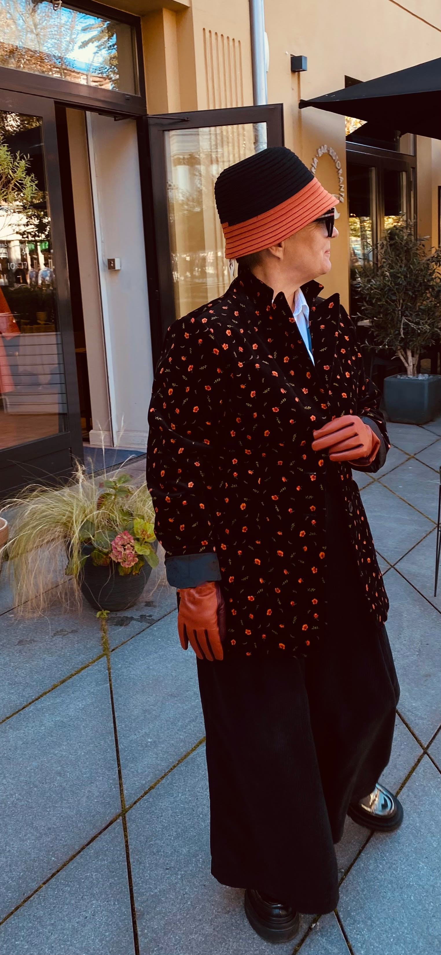 Šis dailiai pasiūtas medvilninis švarkelis su pamušalu išsiskiria moterišku siluetu, klasikiniais atlapais ir subtiliu gėlėtu raštu. Ilgos rankovės, praktiškos kišenės bei užsegimas sagomis suteikia jam funkcionalumo, o prigludęs kirpimas pabrėžia figūrą ir kuria elegantišką įvaizdį.