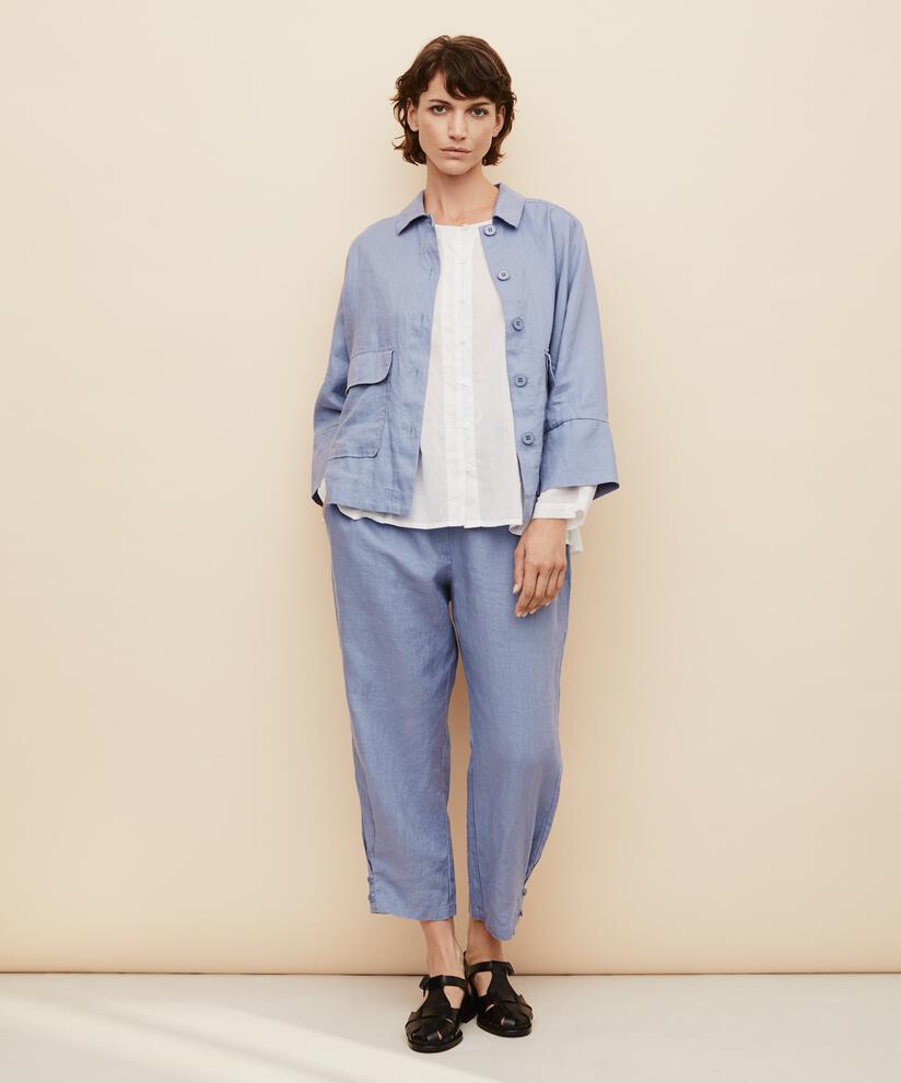 Šis lininis švarkelis sukurtas šviesioms, lengvoms ir stilingoms dienoms. Jo dizainą įkvėpė klasikiniai vyriški marškiniai, tačiau laisvai krintantis siluetas subtiliai prisitaiko prie kūno ir išryškina moterišką lengvumą. Tai drabužis, kuriame susilieja natūralumas, moderni elegancija ir nevaržantis komfortas.
