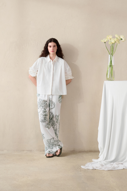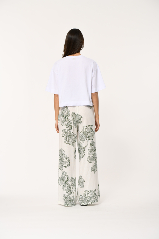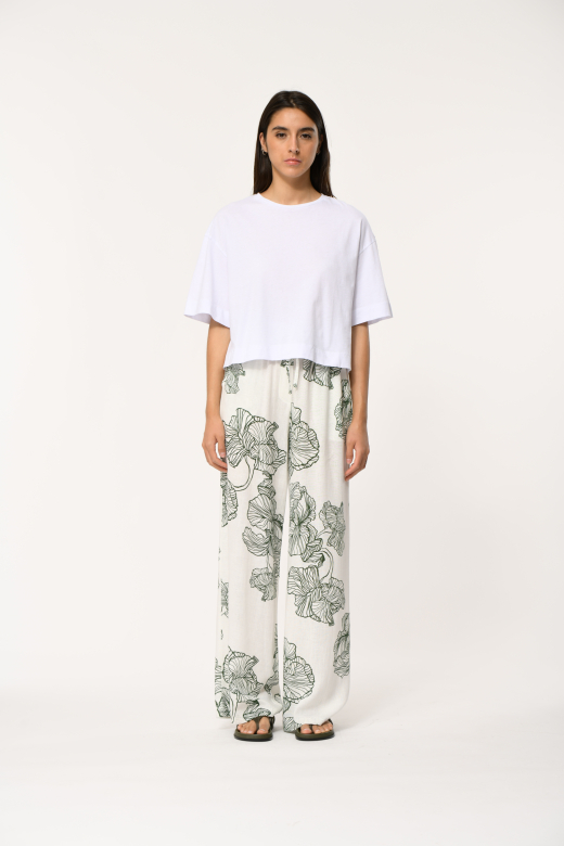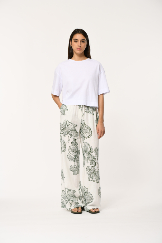 Ilgos kelnės iš lengvai krintančio viskozės ir lino audinio išsiskiria įspūdingu XXL gėlių raštu, kuris įvaizdžiui suteikia gyvybingumo, charakterio ir išskirtinio moteriškumo. Platus, laisvai krintantis siluetas kuria elegantišką judesį ir leidžia jaustis patogiai visą dieną.