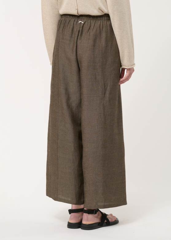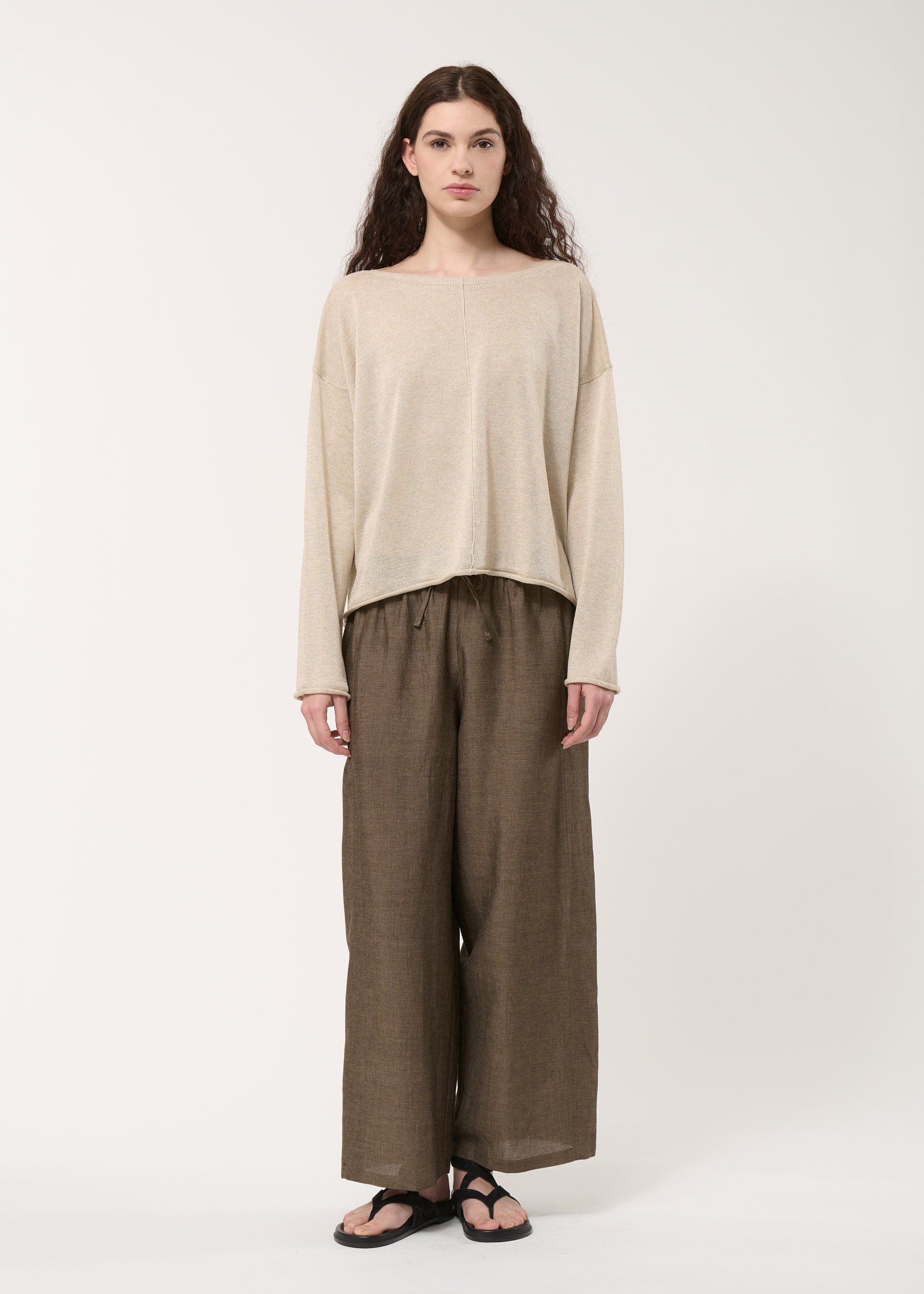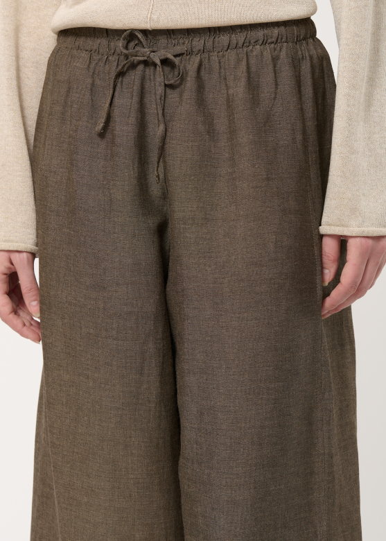 Šios „barrel“ silueto kelnės iš lengvai krintančio viskozės ir lino audinio išsiskiria modernia forma, laisvumu ir natūraliu elegantiškumu. Minkštas, orui laidus audinys suteikia modeliui lengvumo, o išraiškingas kirpimas kuria šiuolaikišką ir stilingą siluetą.