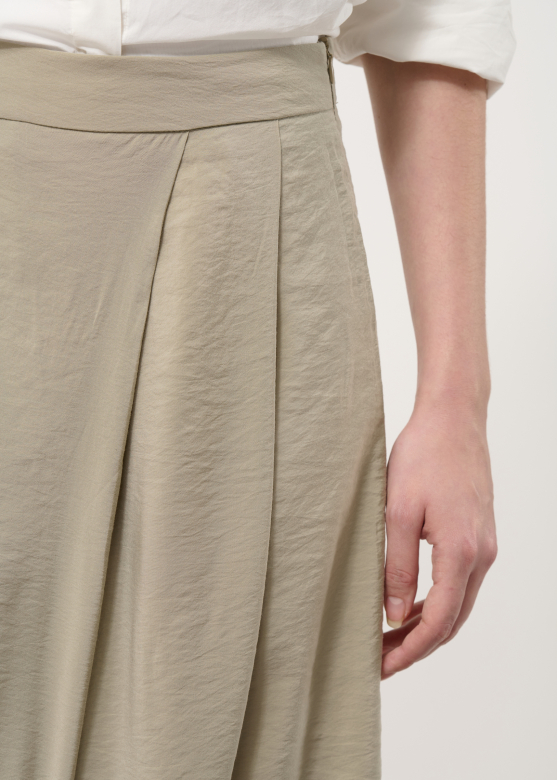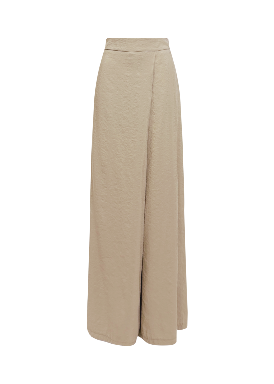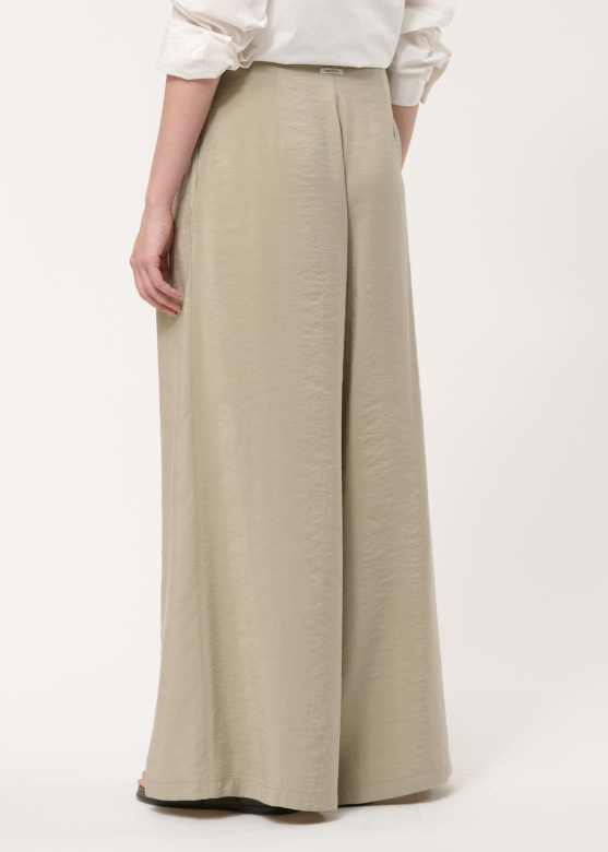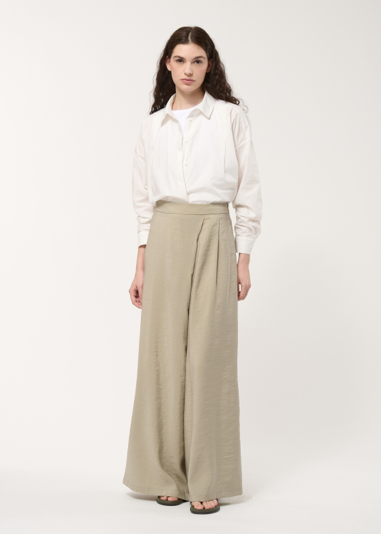 Ilgos persidengiančio silueto kelnės iš faktūriško modalo išsiskiria elegantišku lengvumu ir šiuolaikišku charakteriu. Plačios klešnės dailiai juda kartu su kūnu, o minkštas, subtiliai tekstūruotas audinys suteikia modeliui rafinuoto išskirtinumo.