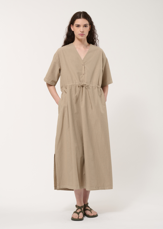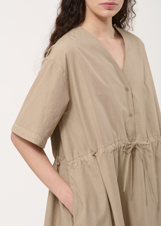 Liemuo reguliuojamas sutraukiamu raišteliu, todėl suknelę galima lengvai pritaikyti pagal norimą siluetą – pabrėžti figūrą arba išlaikyti laisvesnį kritimą. Sagstoma V formos iškirptė suteikia modeliui elegantiško lengvumo, o trumpos rankovės su nuleista pečių linija kuria šiuolaikišką, nevaržantį įvaizdį. Dar daugiau patogumo suteikia šoninėse siūlėse paslėptos kišenės, o švelniai apvalinta apačia papildo bendrą siluetą minkštumu.