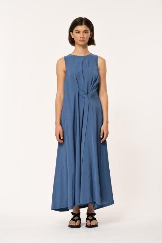 Apvali iškirptė suteikia modeliui švaros ir išbaigtumo, o šone esanti sagute reguliuojama detalė leidžia subtiliai keisti formą ir suteikia suknelei išskirtinio charakterio. Be rankovių sukurtas modelis atrodo lengvai ir gaiviai, o nugaroje esanti lašo formos iškirptė, užsegama sagute, tampa dailiu, moterišku akcentu. Švelniai apvalinta apačia papildo bendrą siluetą minkštumu ir lengvumu.