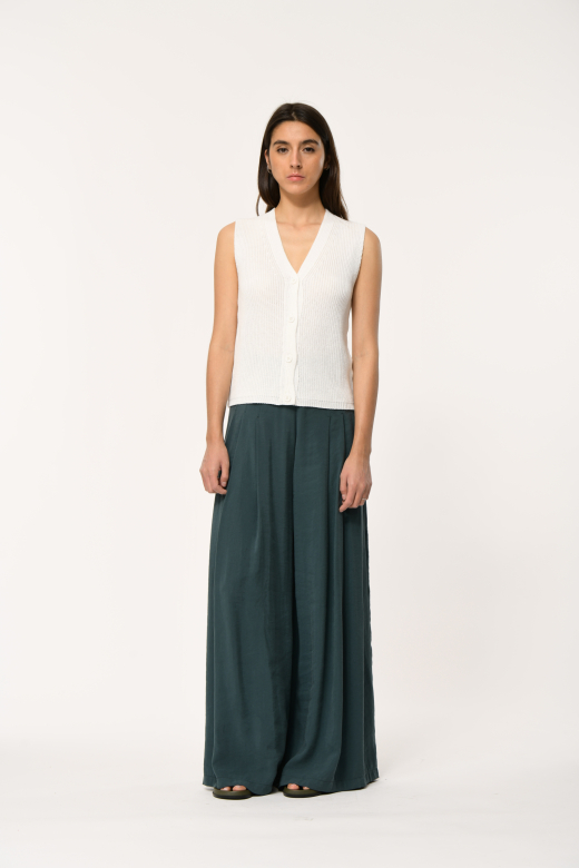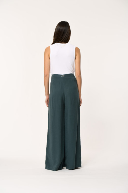 Šios plačių klešnių culotte tipo kelnės iš lengvai krintančio modalo žavi elegantišku judesiu ir moderniu siluetu. Aukštas liemuo dailiai išryškina figūrą, o minkštas audinys suteikia modeliui lengvumo, grakštumo ir rafinuoto laisvumo.