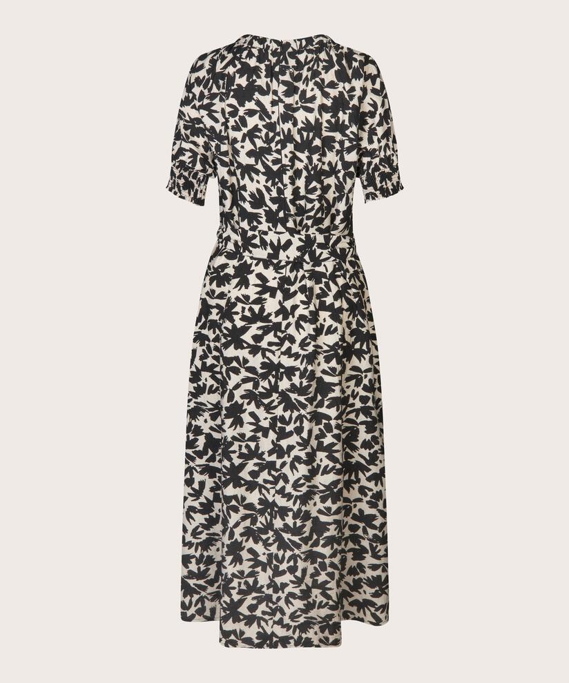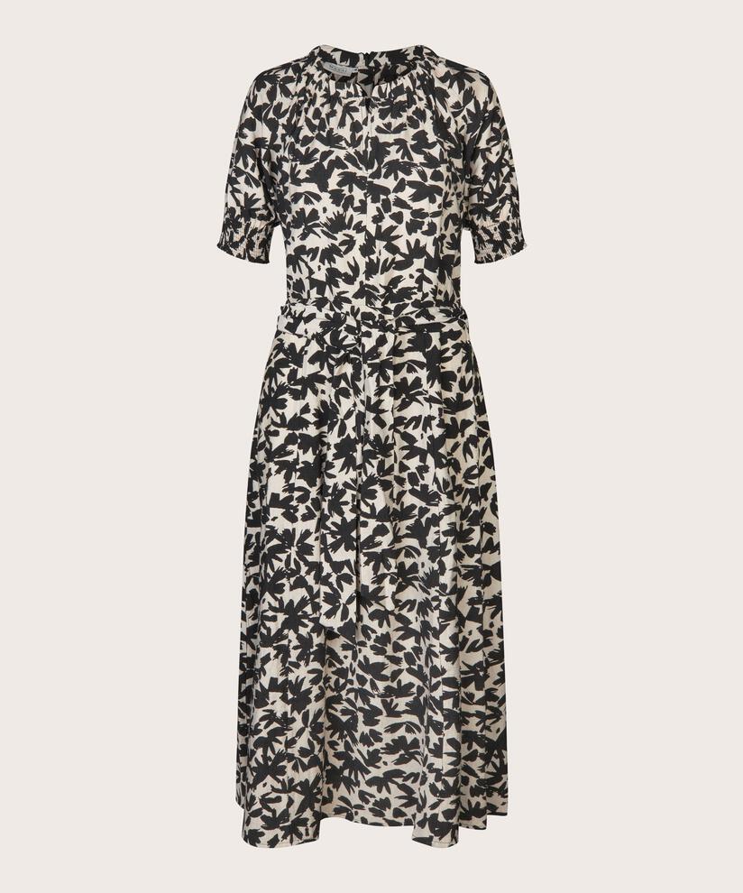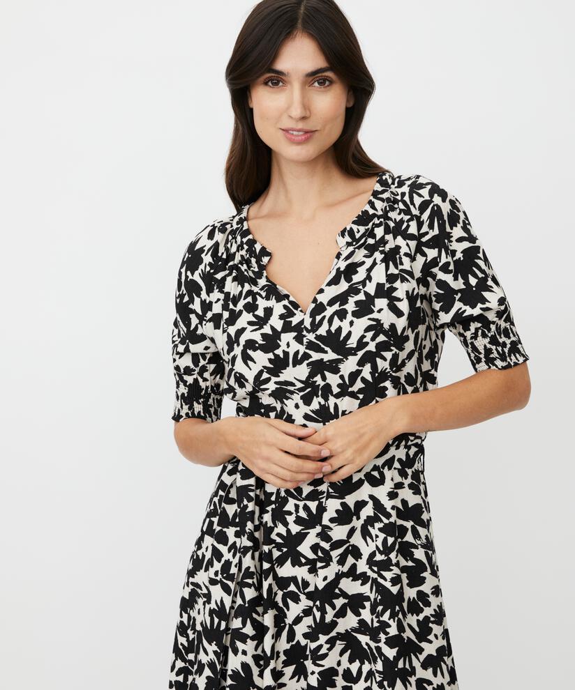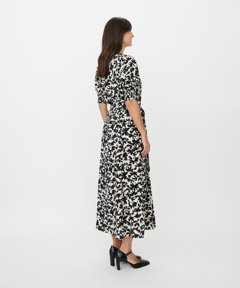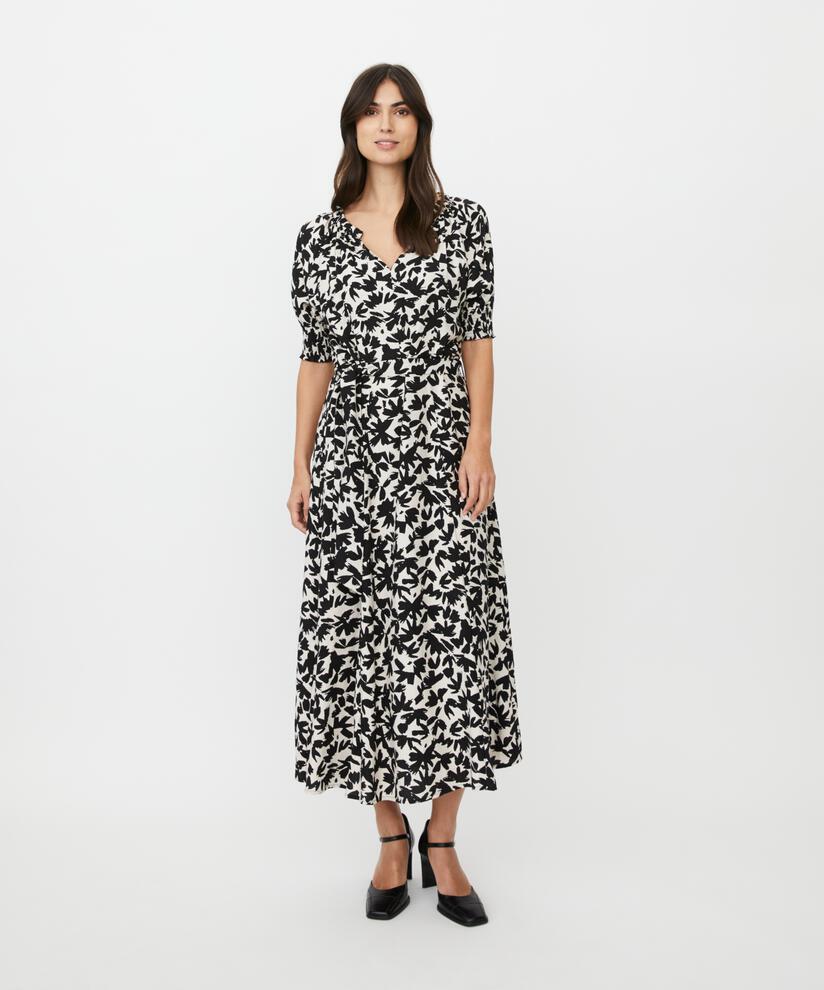 Pasilepinkite šia juodai balta viskozine suknele, kurioje tobulai susilieja elegancija ir komfortas. Išraiškingas gėlių raštas suteikia modeliui savitumo ir subtilaus charakterio, o moterišką siluetą pabrėžiantis kirpimas leidžia jaustis lengvai, bet itin stilingai.