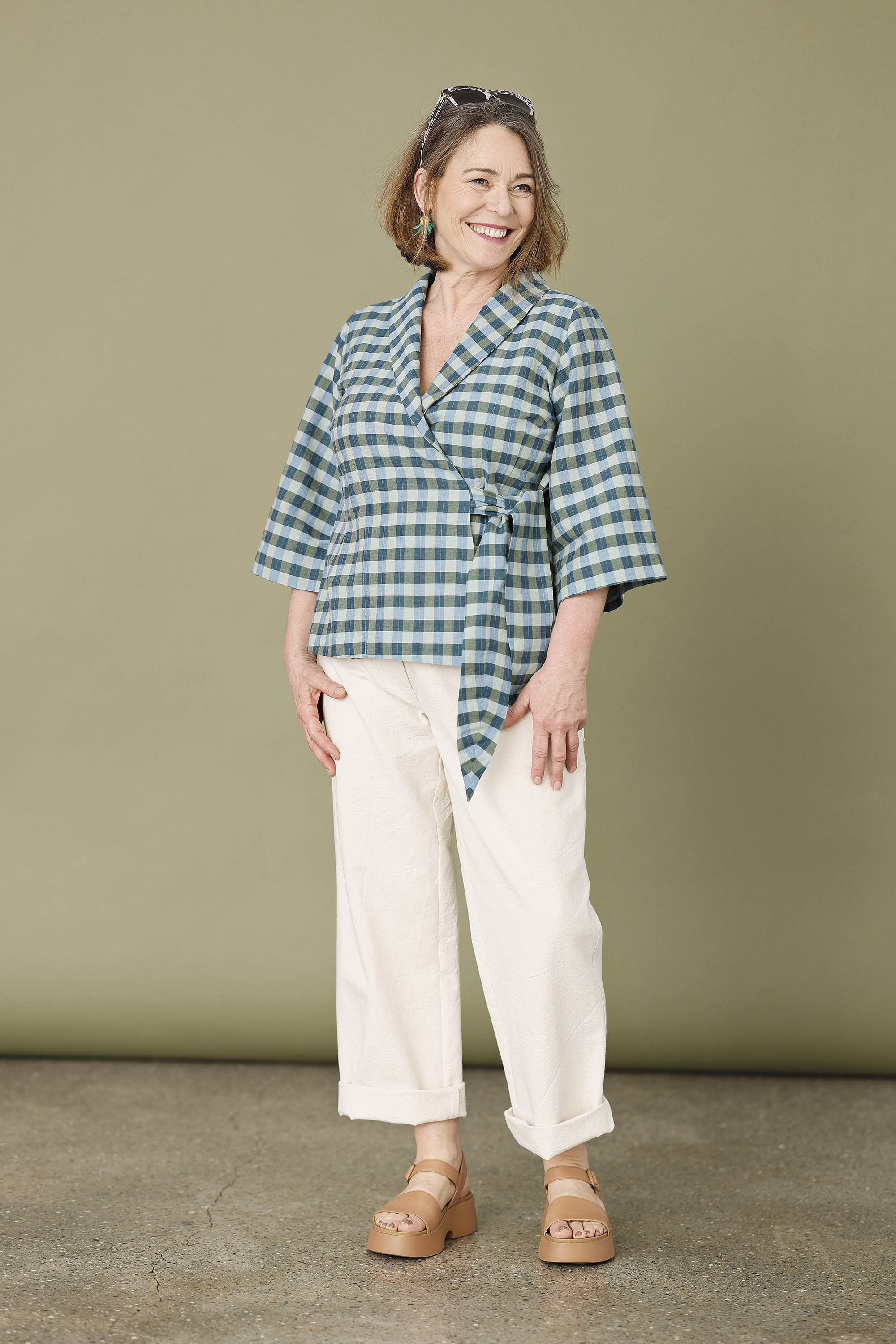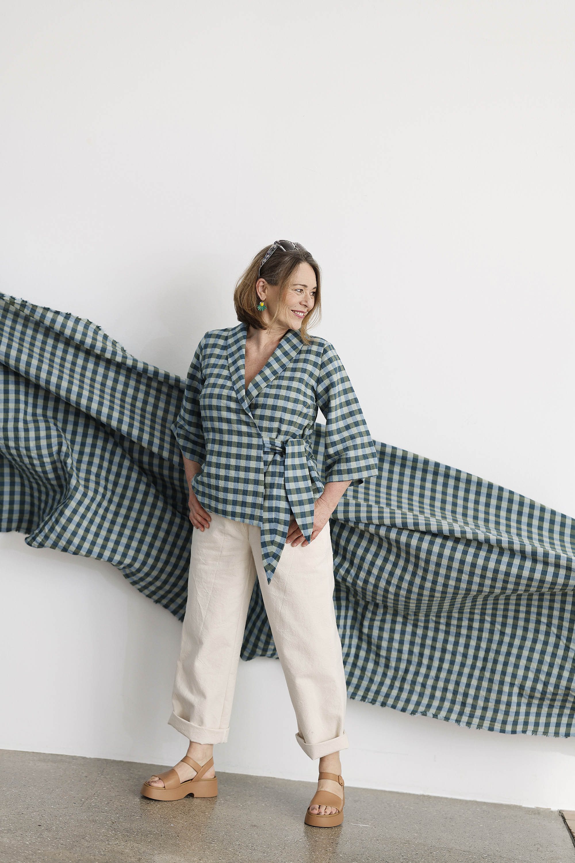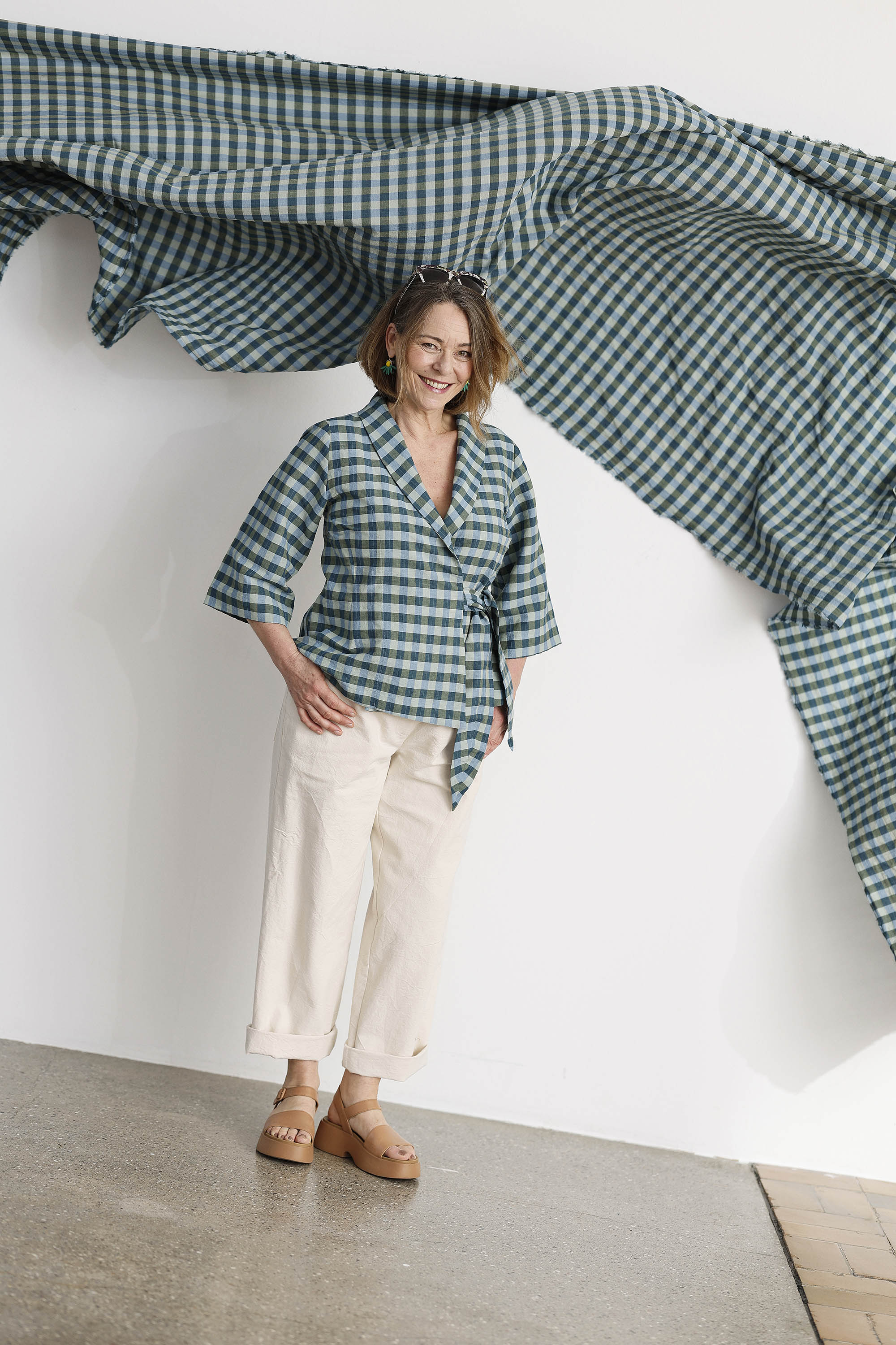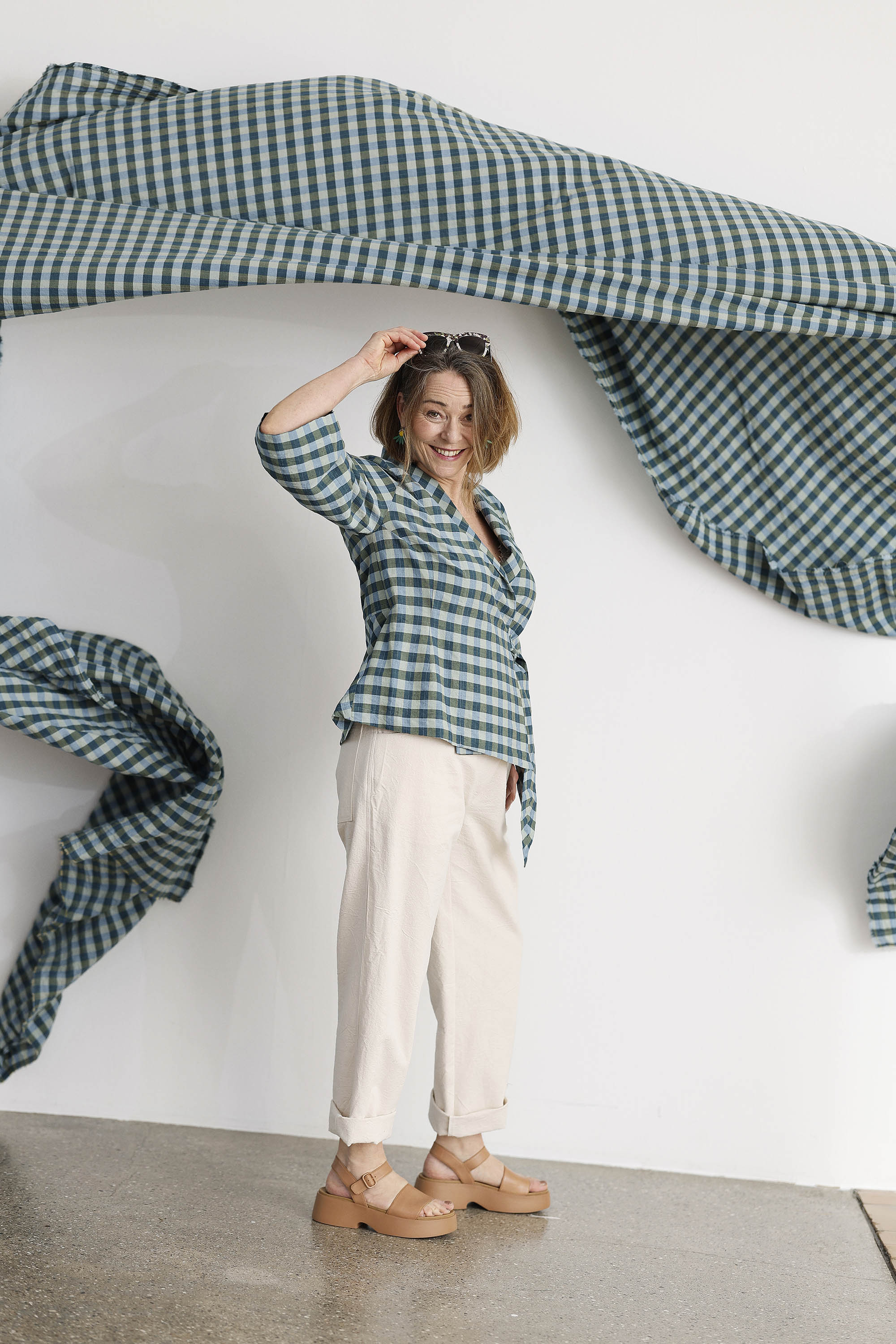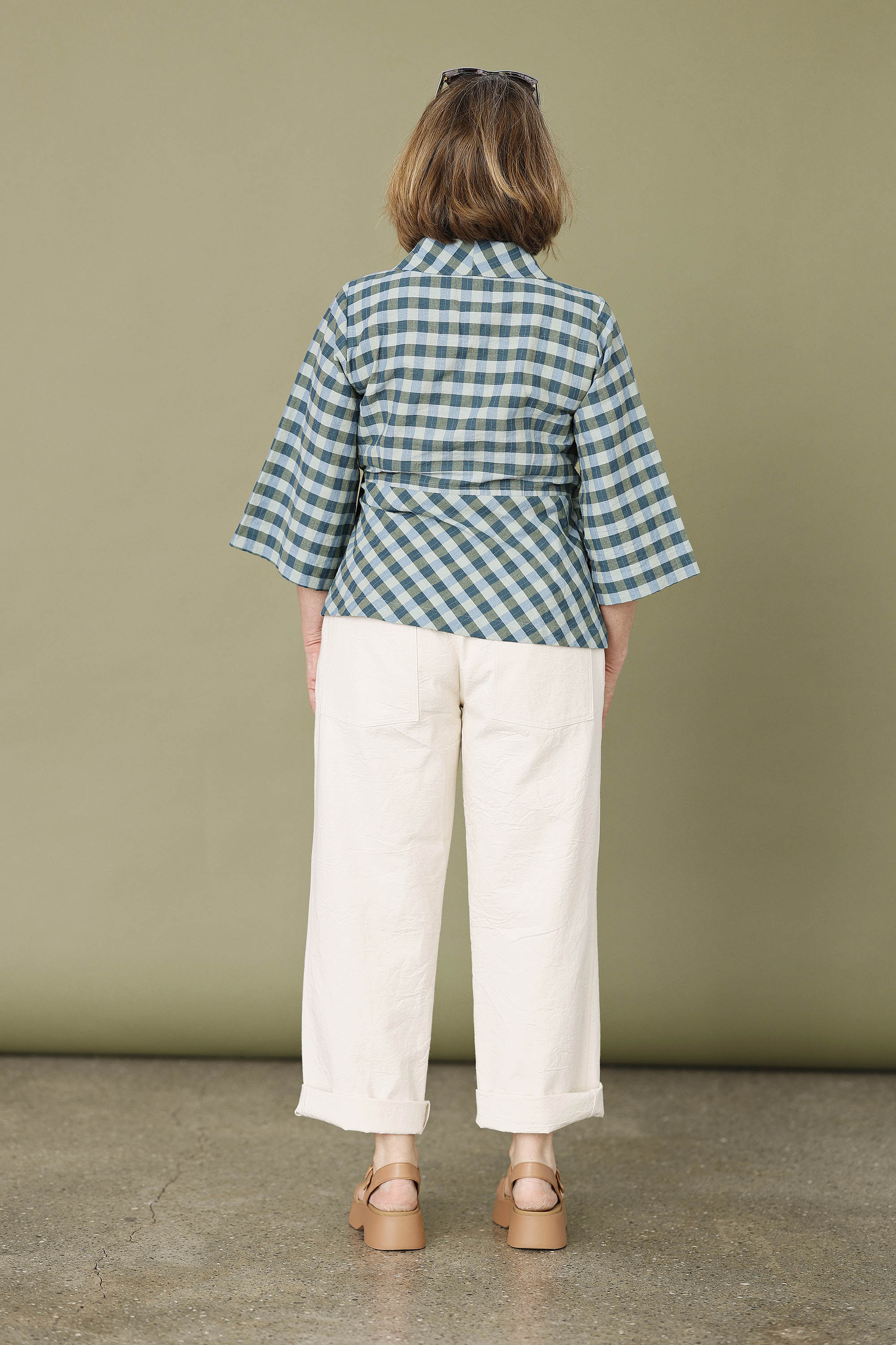 Palaidinė išsiskiria dailiu, figūrą pabrėžiančiu siluetu. Šaliko tipo apykaklė suteikia modeliui švelnios elegancijos, o surišimas abiejose pusėse tokio pat languoto audinio juostelėmis sukuria išbaigtą ir labai moterišką įspūdį. 3/4 ilgio rankovės papildo modelį lengvumu ir leidžia jį lengvai pritaikyti tiek kasdienai, tiek puošnesniam deriniui.