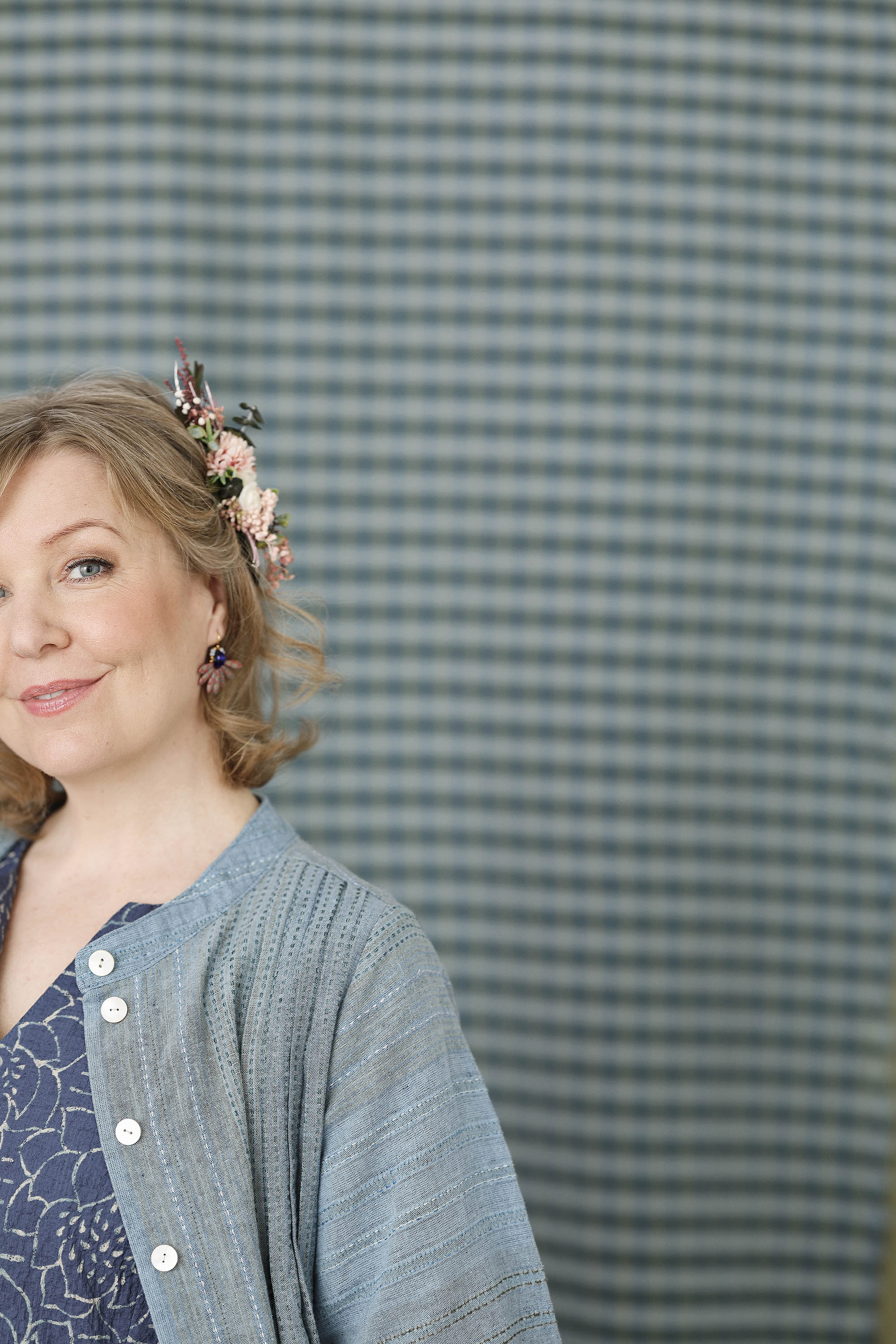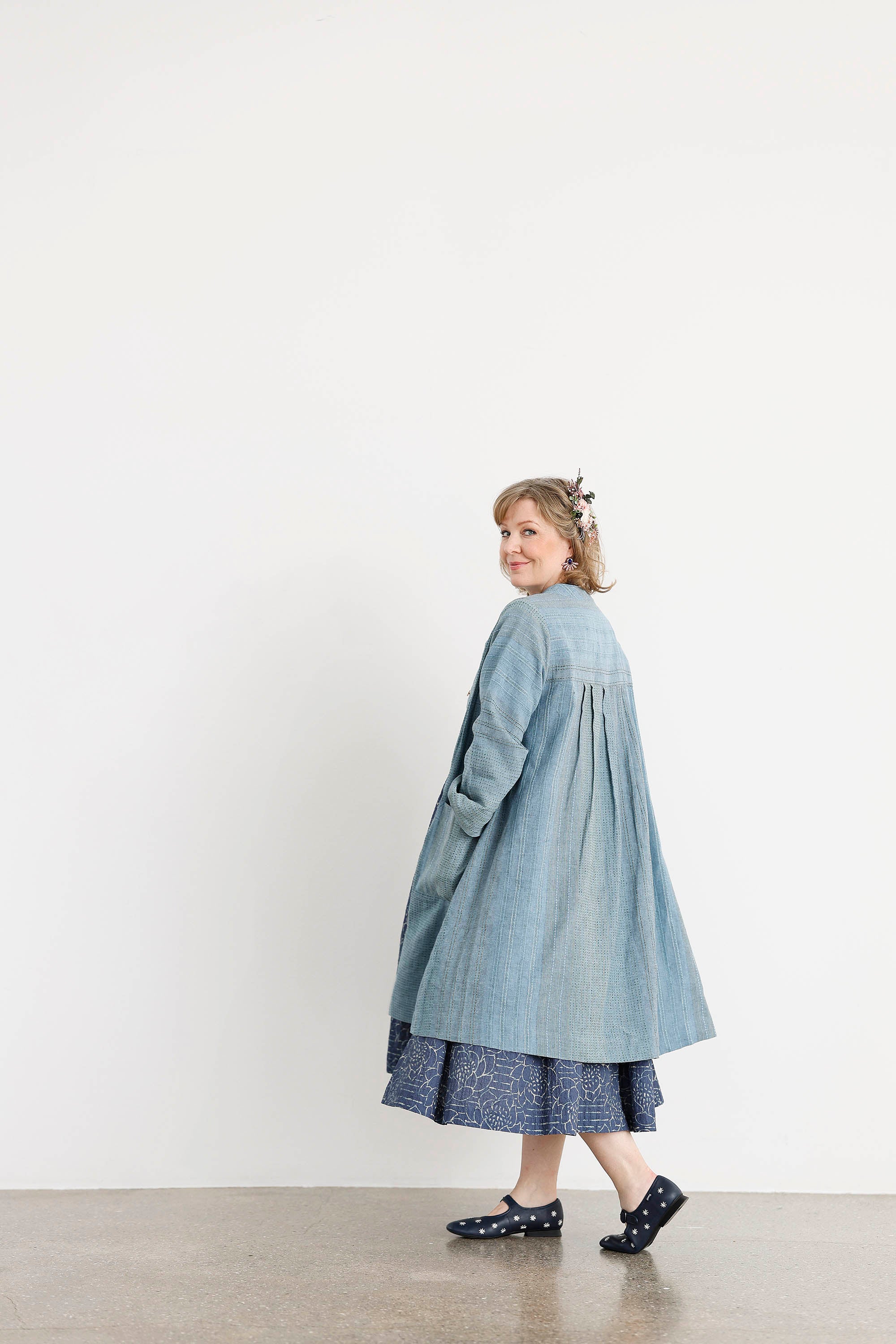 Gražūs ilgi „Helle“ marškiniai–švarkelis, kuriuos galima vilkėti įvairiais būdais ir lengvai pritaikyti prie skirtingų derinių. Šviesiai mėlynas, jūros mėlynumo atspalvio lino ir medvilnės audinys išsiskiria subtiliais dryželiais bei smulkiu žalsvu dygsniavimu, todėl atrodo itin savitai, rafinuotai ir išskirtinai. Tai ypatingas audinys, suteikiantis modeliui charakterio ir lengvos prabangos pojūtį.