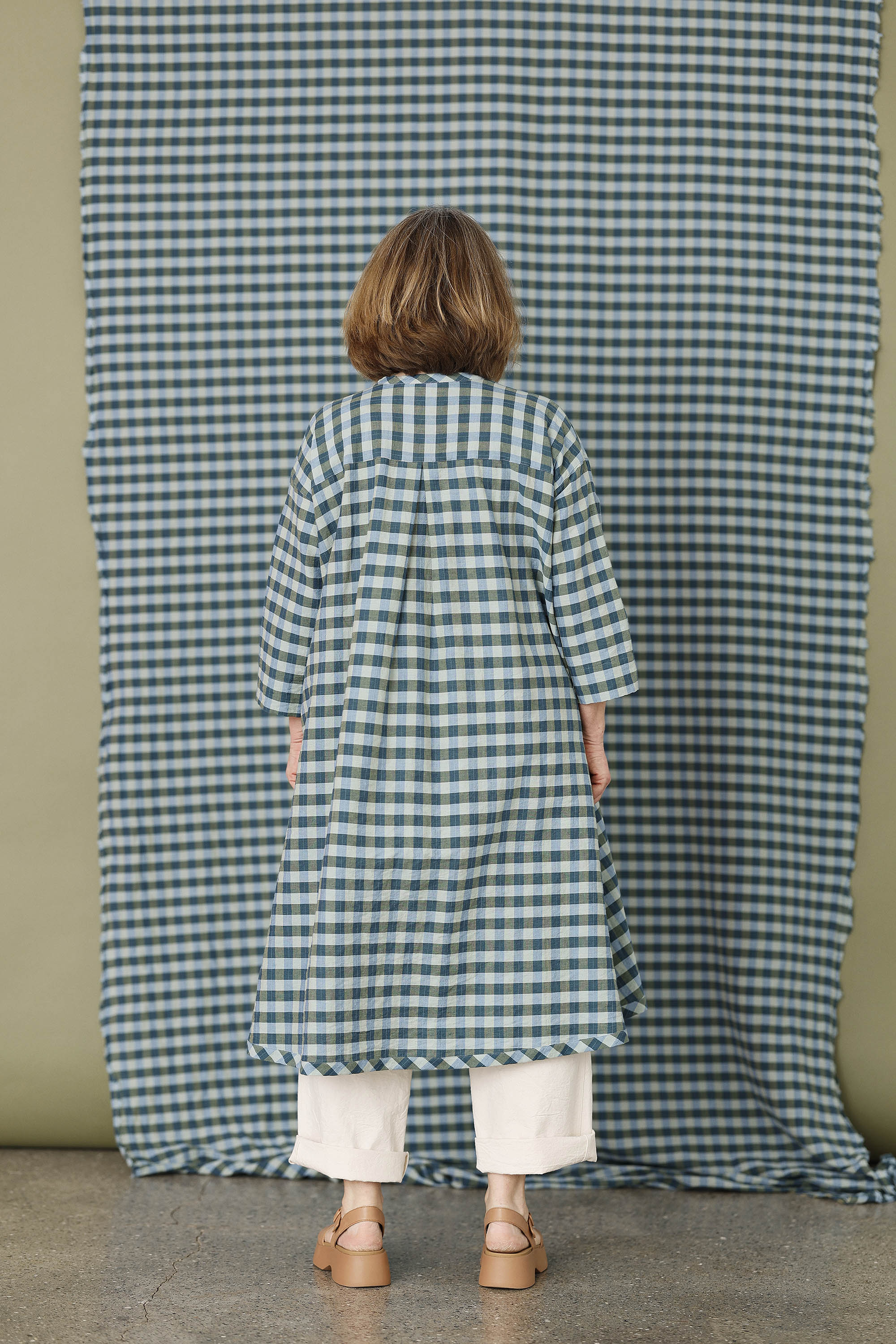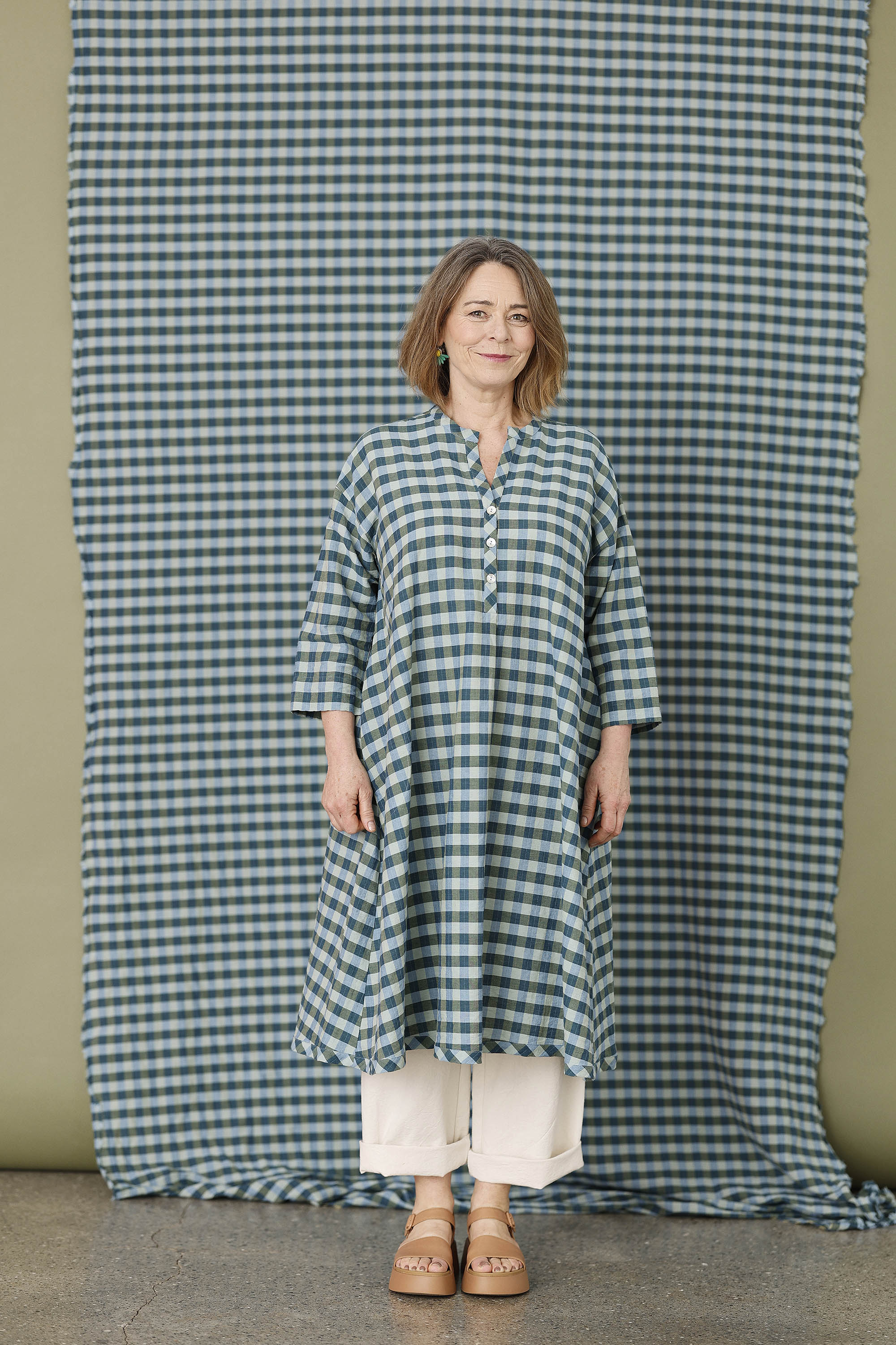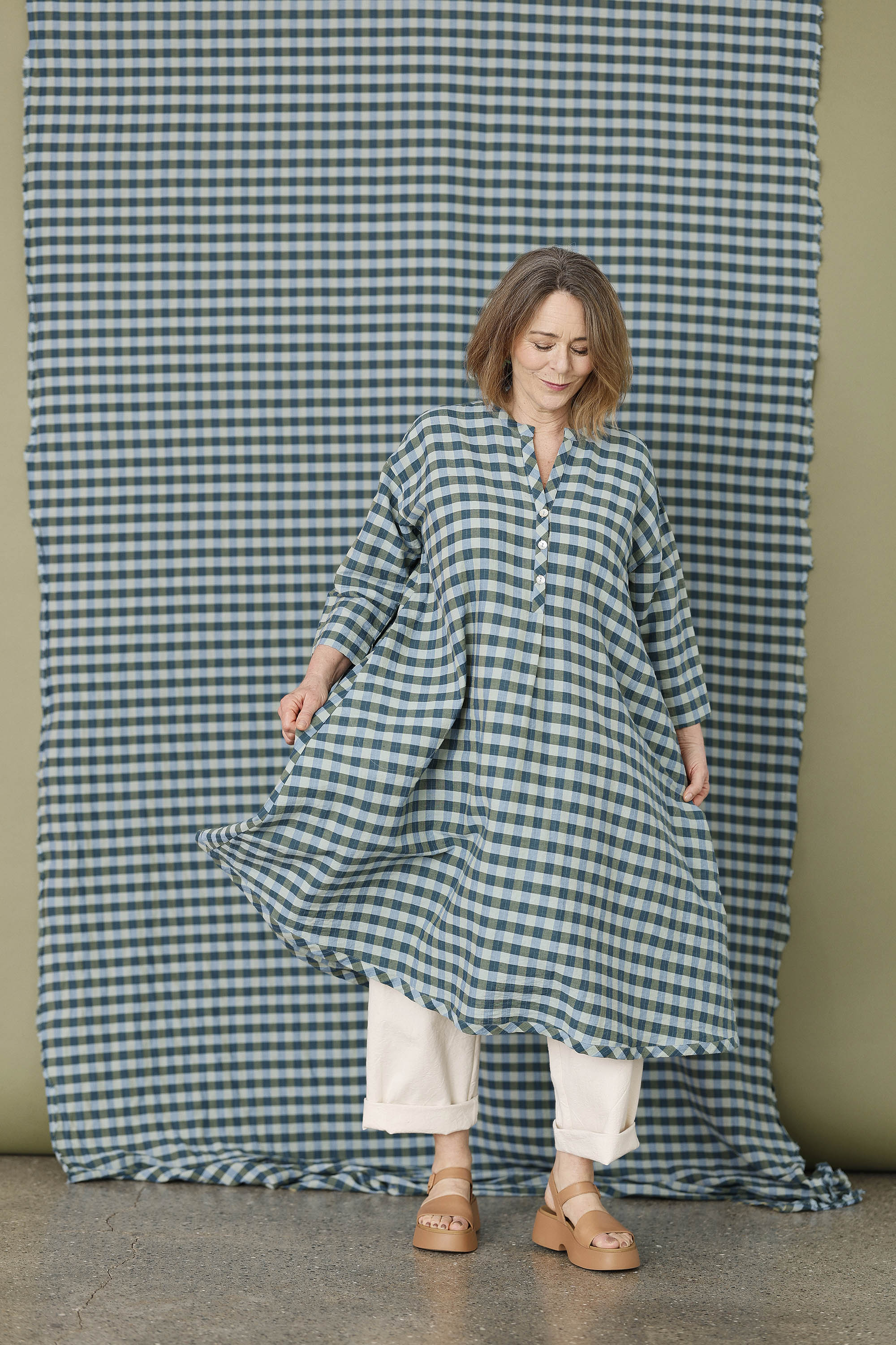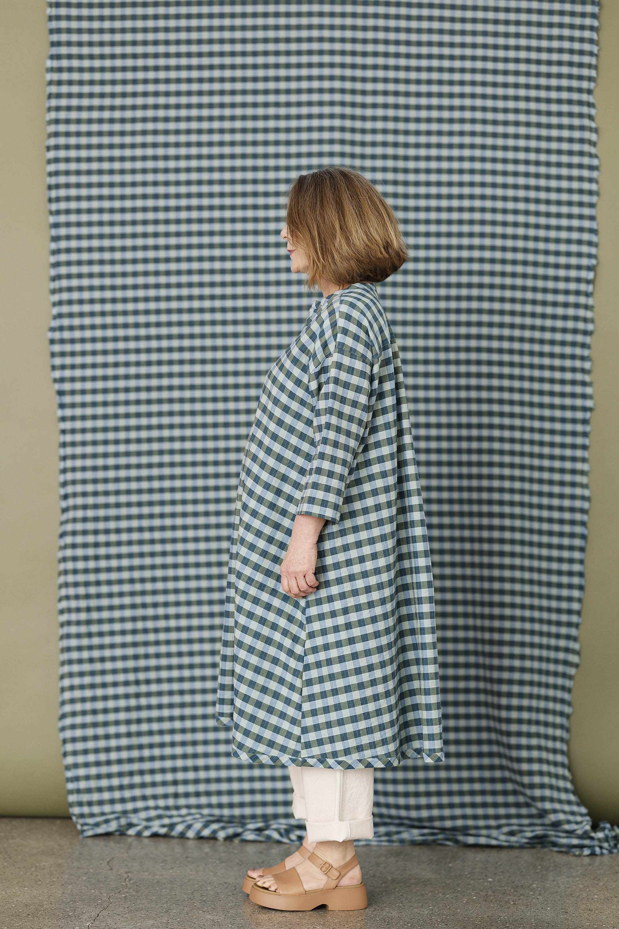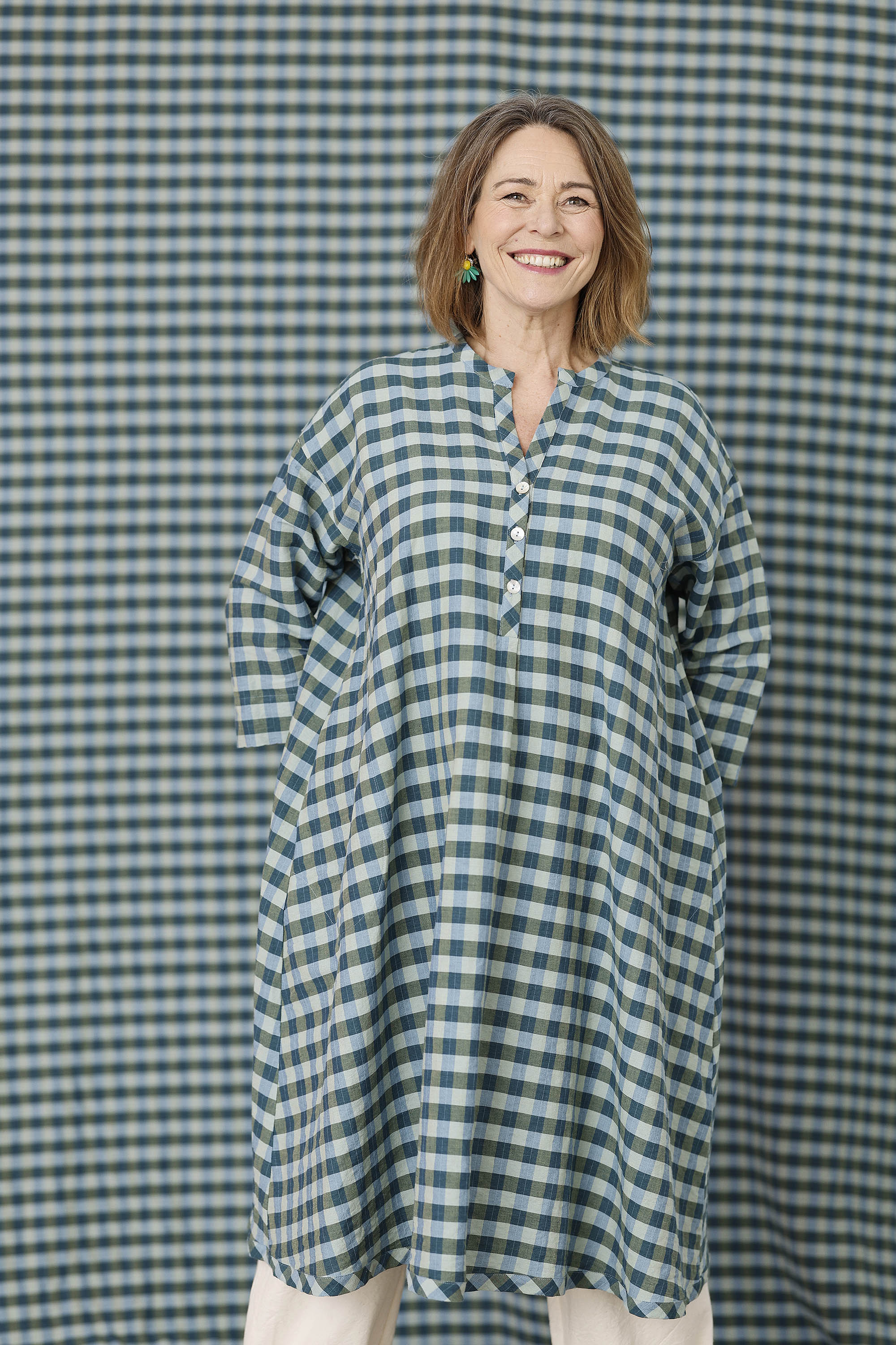 Graži languota A silueto suknelė, kuri išsiskiria lengvumu, charakteriu ir šiuolaikišku laisvumu. Žalių ir mėlynų atspalvių langeliai kuria gaivų, labai dėkingą derinį, kuris atrodo ir subtiliai, ir išraiškingai. Oversized kirpimas leidžia suknelei dailiai kristi, o aukštos kokybės medvilnės ir lino audinys suteikia natūralų lengvumą bei išskirtinį komfortą.