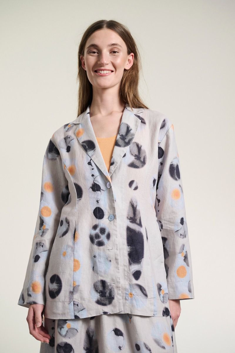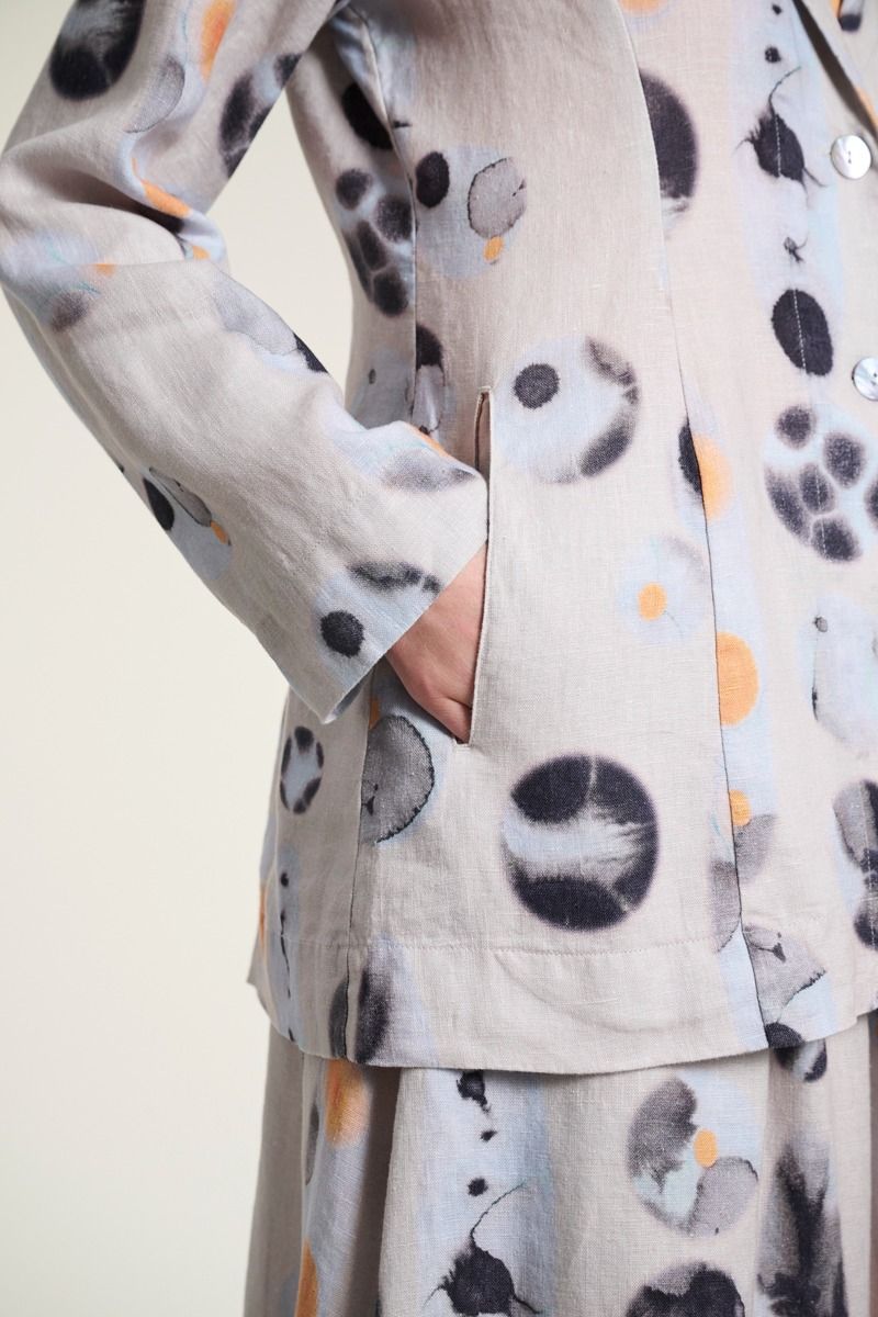 Prabangios lino kokybės švarkas su subtiliai detaliu, išraiškingu raštu, kuris kiekvienam deriniui suteikia charakterio. Tai modelis, kuriame natūrali medžiaga susilieja su moderniu siluetu – lengvas, tačiau išraiškingas pasirinkimas sezonui.
