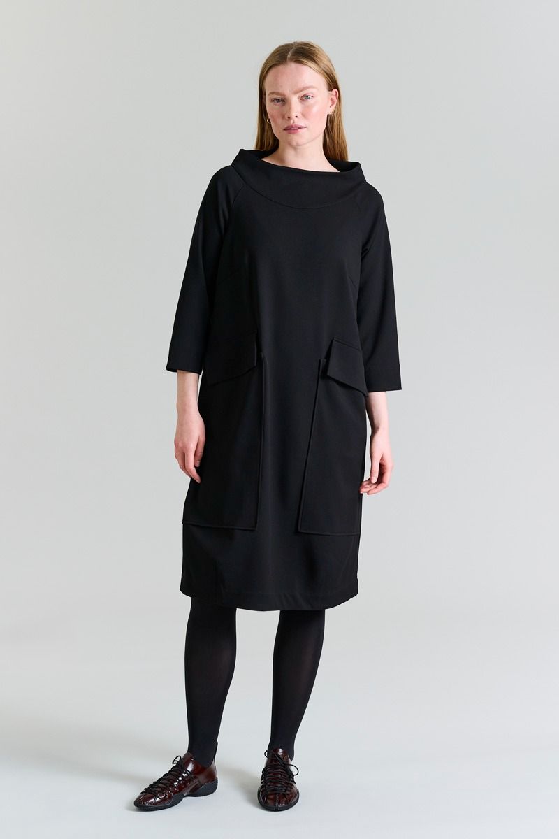 Išraiškinga Kenedy suknelė su stovinčia apykakle – tikras dizaino perlas, kuris išsiskiria savo minimalistine, bet galinga estetika. Didelė stovinti apykaklė sukuria modernų siluetą, o įspūdingos, didelės kišenės suteikia charakterio bei praktiškumo.