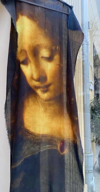 Šis išskirtinis šalikas dvelkia ramybe, švelnumu ir klasikine renesanso estetika. Jį puošia subtilus, ikonografiškas moters portretas, primenantis Madonos atvaizdus iš senųjų meistrų tapybos. Šilti auksiniai šešėliai ir tamsus fonas kuria nepaprastai jaukią, paslaptingą ir elegantišką nuotaiką.